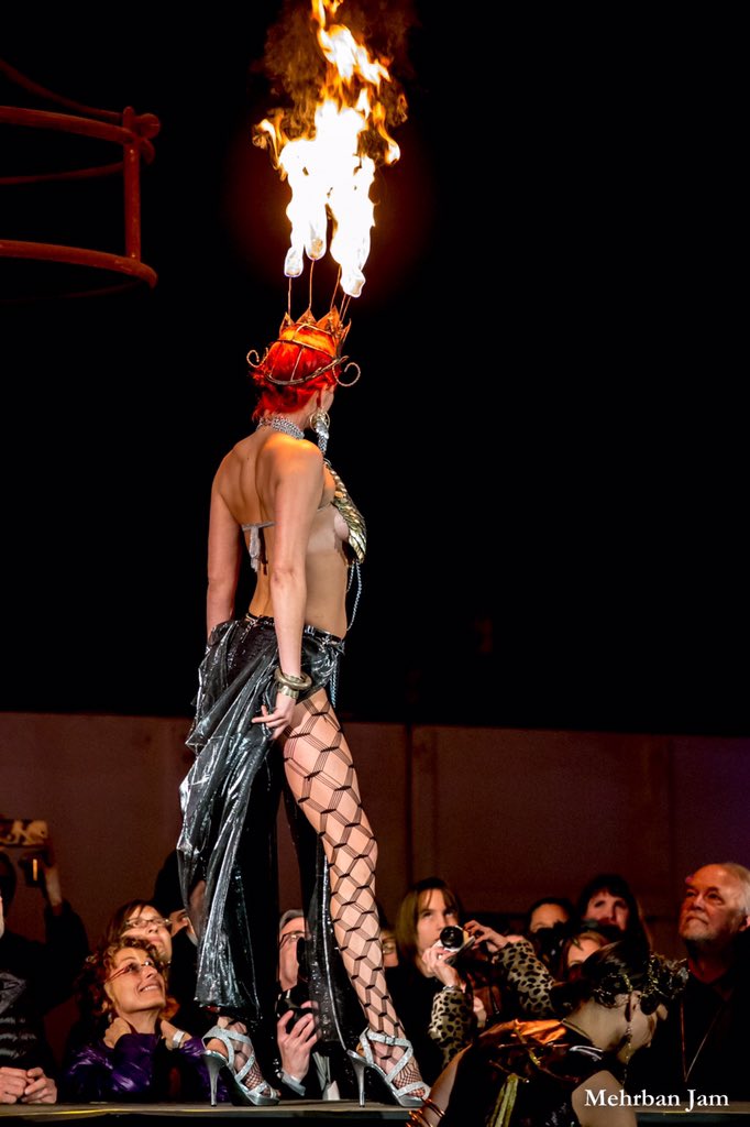 [ They took his theme and ran with it, it seems -- Mick finds himself in an odd fire themed outfit and as he doesn't have hair to style, they gave him a very strange hat and dark makeup.